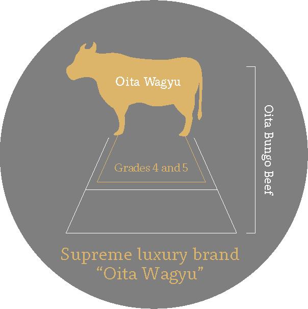 Since winning the top prize at the national beef fair held in 1921, Oita Bungo Beef has been crowned number one in Japan on numerous occasions. Oita Wagyu was launched as a leading brand of Oita Bungo Beef, in celebration of its 100th anniversary. Among high-quality Oita Bungo Beef, only superb Oita Bungo Beef with a meat quality grade of 4 or above on a scale of 1 to 5, from cattle that are raised by farmers highly dedicated to the pursuit of deliciousness, can be branded as “Oita Wagyu.”