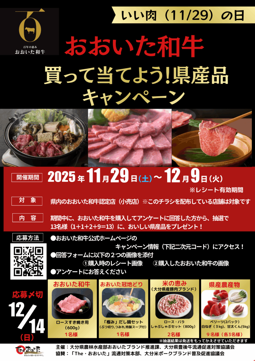 11月29日は、いい肉の日!ということで、「おおいた和牛」を購入した方から抽選で大分県産品が当たるキャンペーンを開催します。